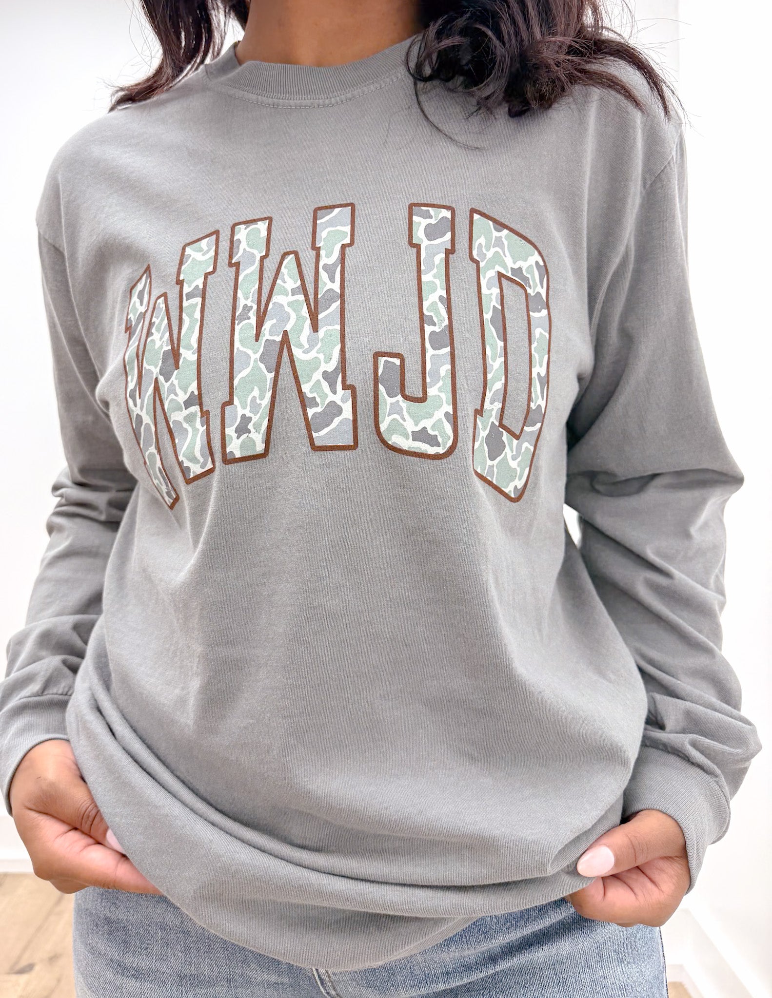 Addyson Nicole Company WWJD Camo Print LS Tee in Grey