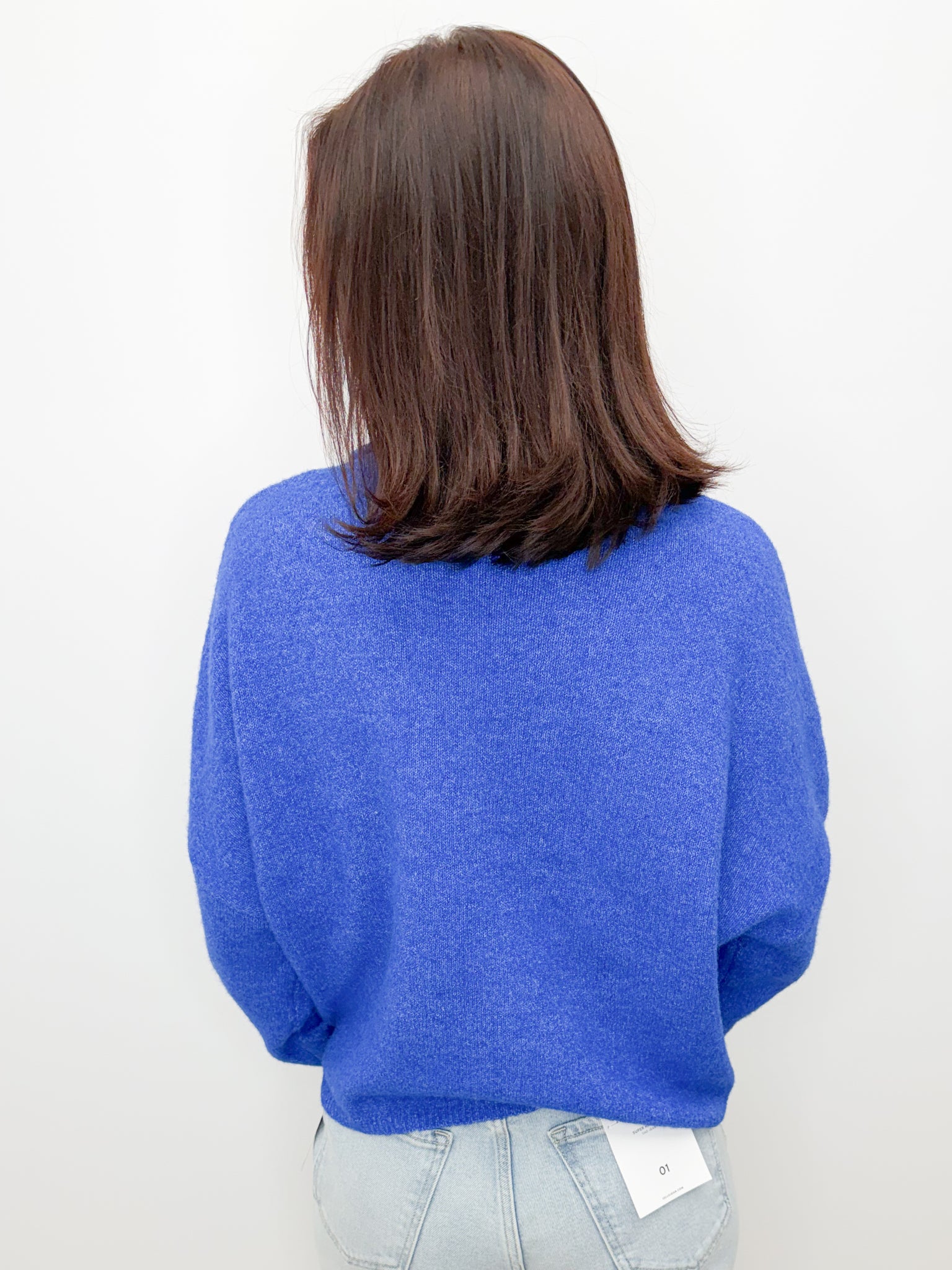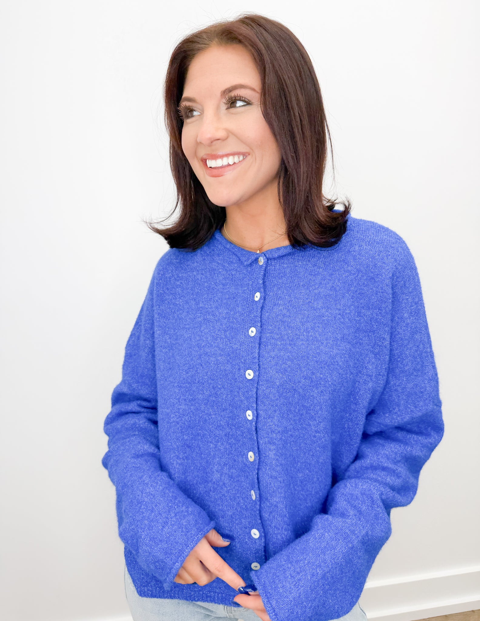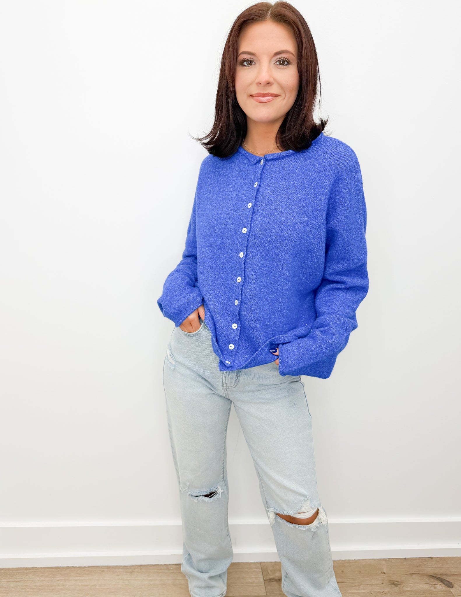 Soft and cozy lightweight cardigan with rolled edge finish on the sleeves and collar.