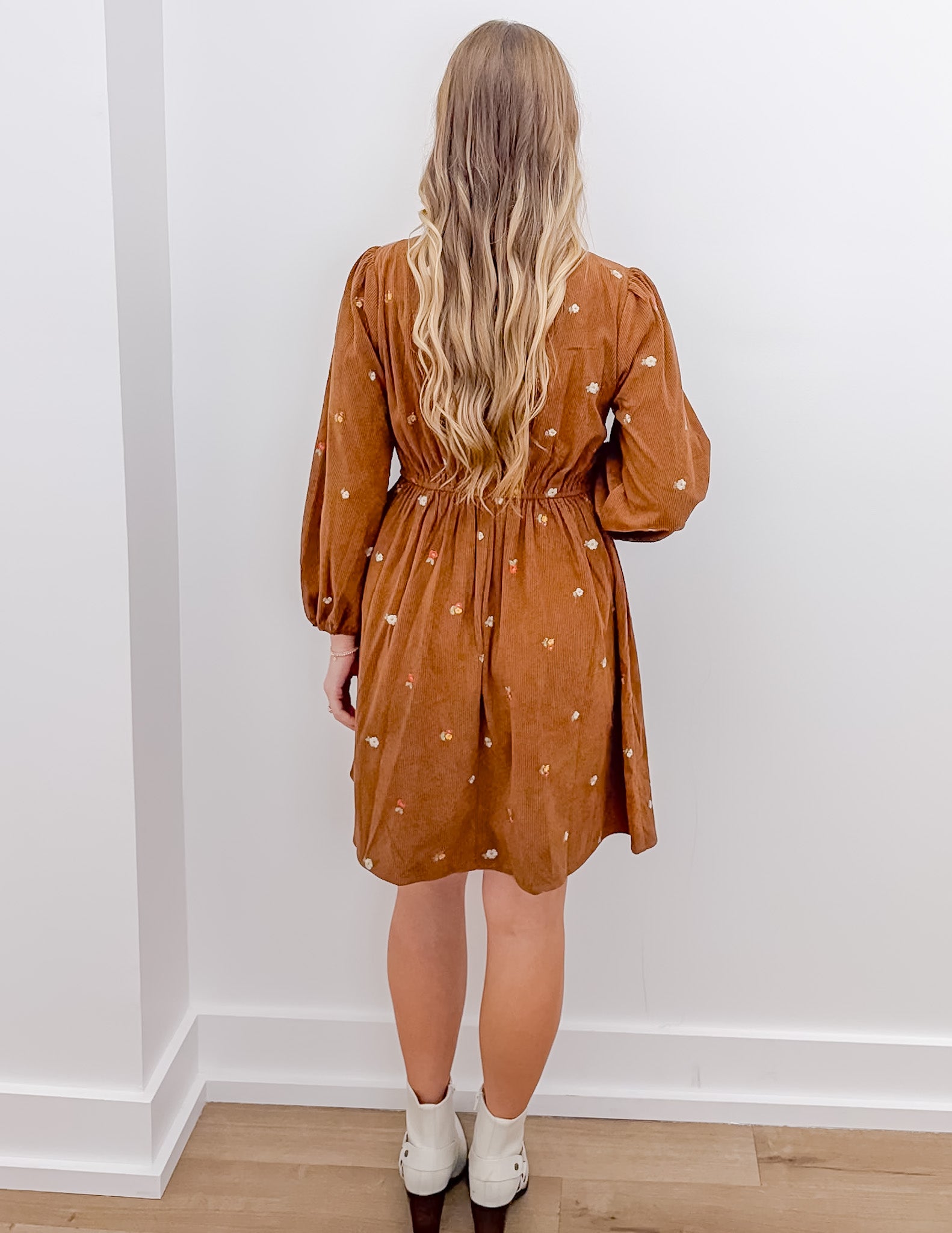 Same As Me Floral Embroidered Corduroy Mini Dress in Mocha
