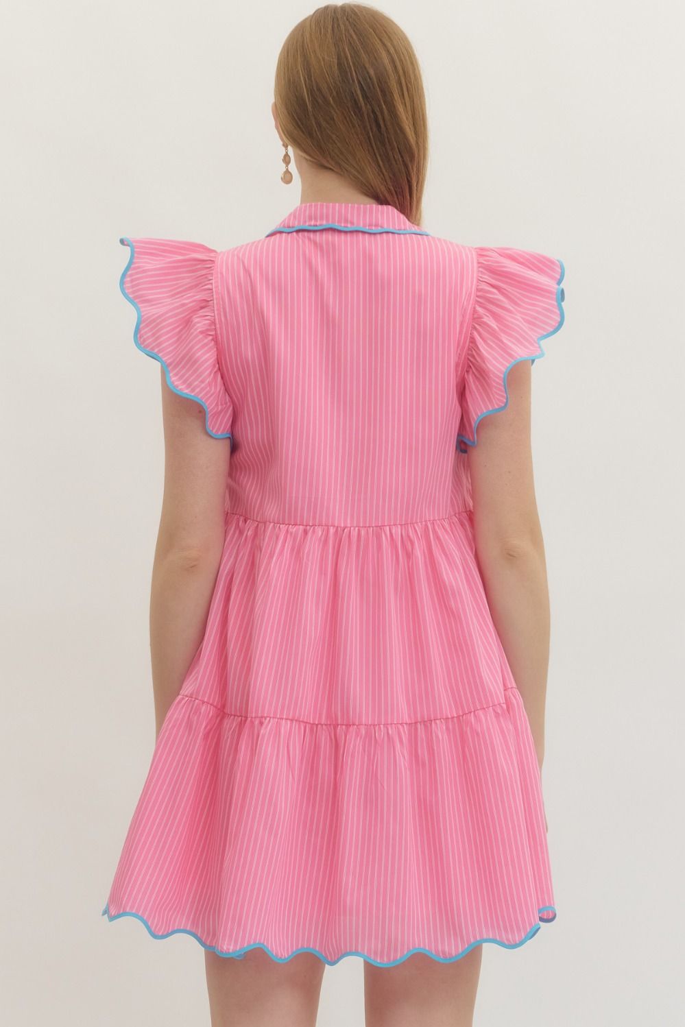 Stripe flutter sleeve mini dress featuring contrast binding. Button closure at front. Side pockets. Lined. Woven. Non-sheer. Lightweight.