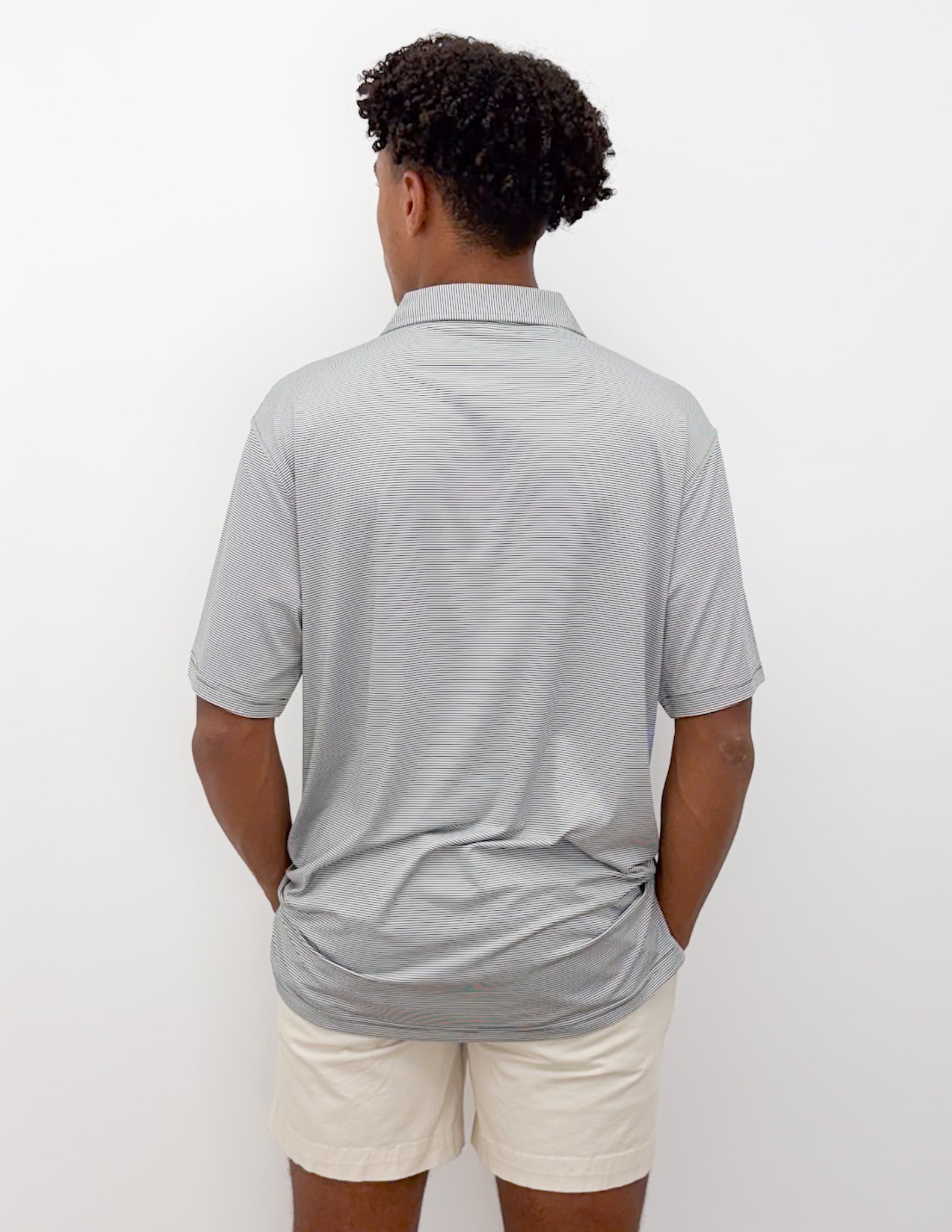 Our MS State Outline striped polo is JNJ's take on a classic Alabama men's polo style. Charcoal and white stripes are woven into the performance material creating a subtle yet sharp micro stripe pattern. The left chest is embroidered with the MS State Outline logo.