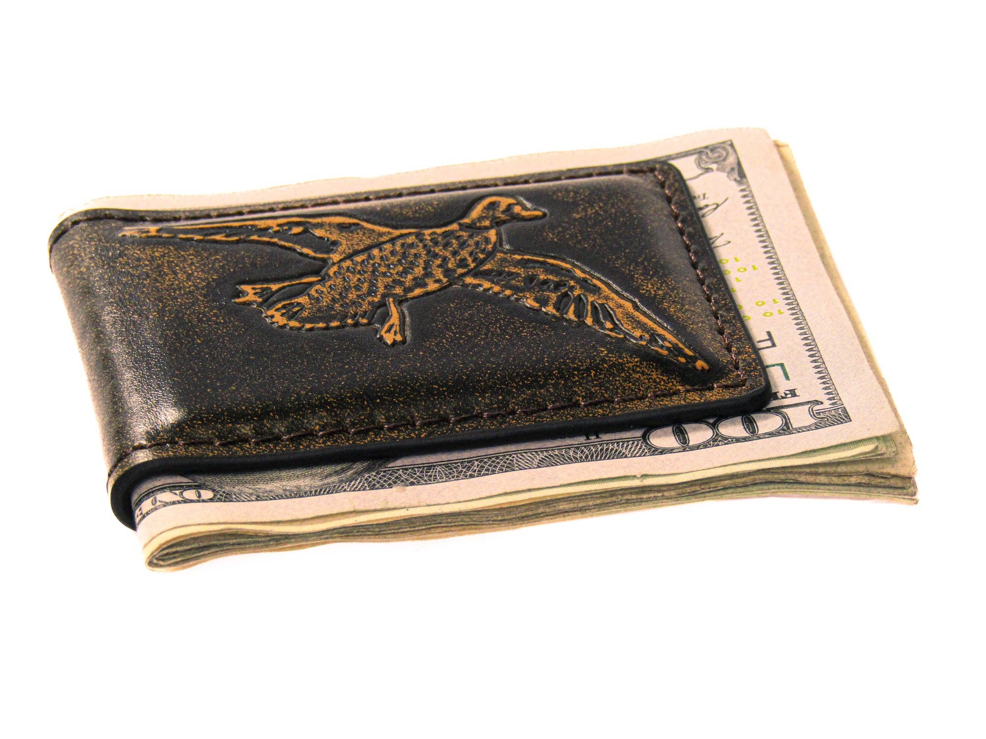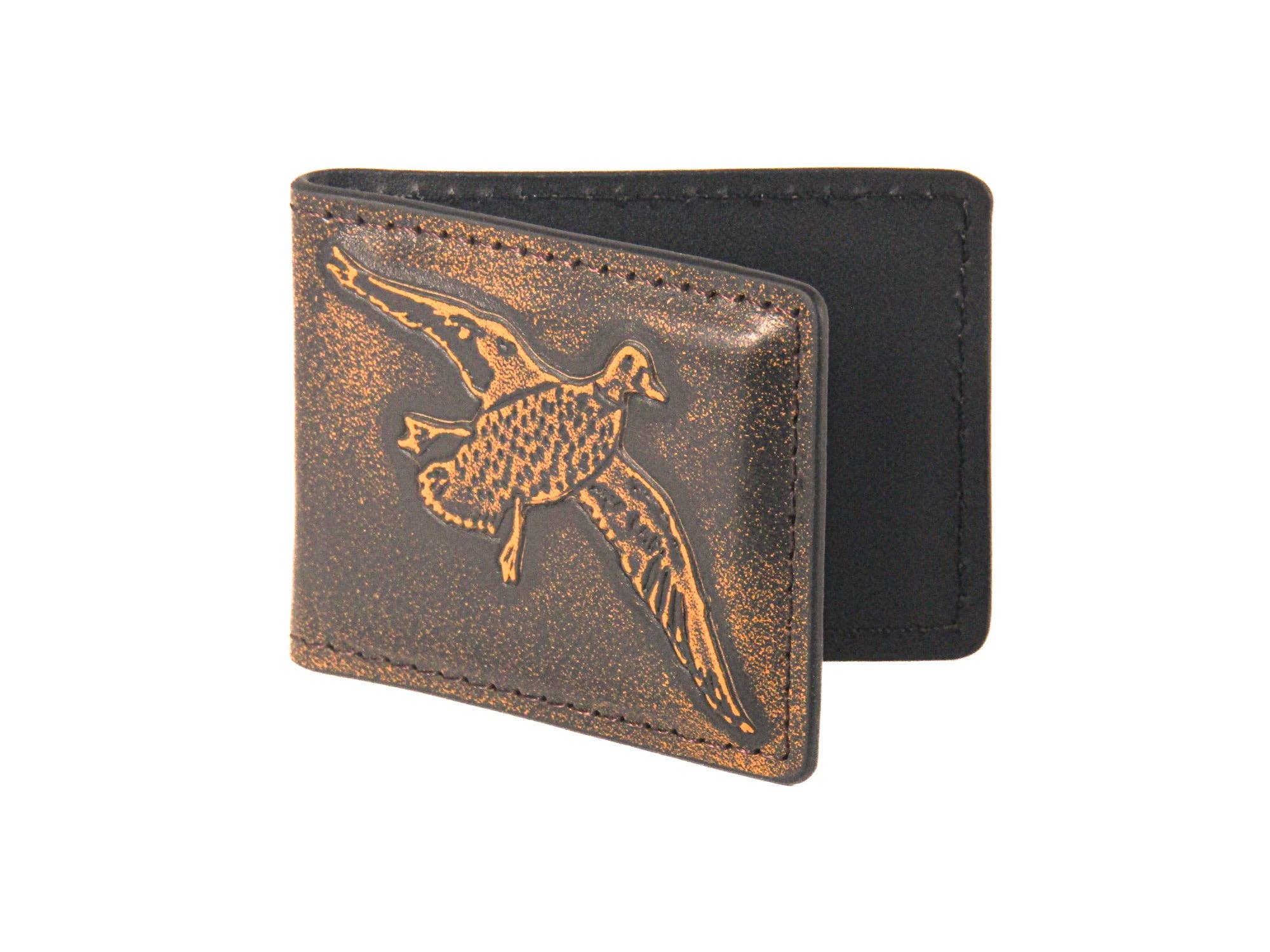 Show your passion with an original Zep-Pro burnished leather money clip featuring a Mallard design. The duck imagery on these wallets taps into our intrinsic connection to nature and wildlife. It is a stylish and unique way to show enthusiasm while keeping important cards and cash organized. This Zep-Pro wallet is constructed of full grain leather with a hand burnished finish and features the Mallard design, proudly displayed on the overlapping sides. The design and placement of the large logo is intended to appear partially on the front and back.