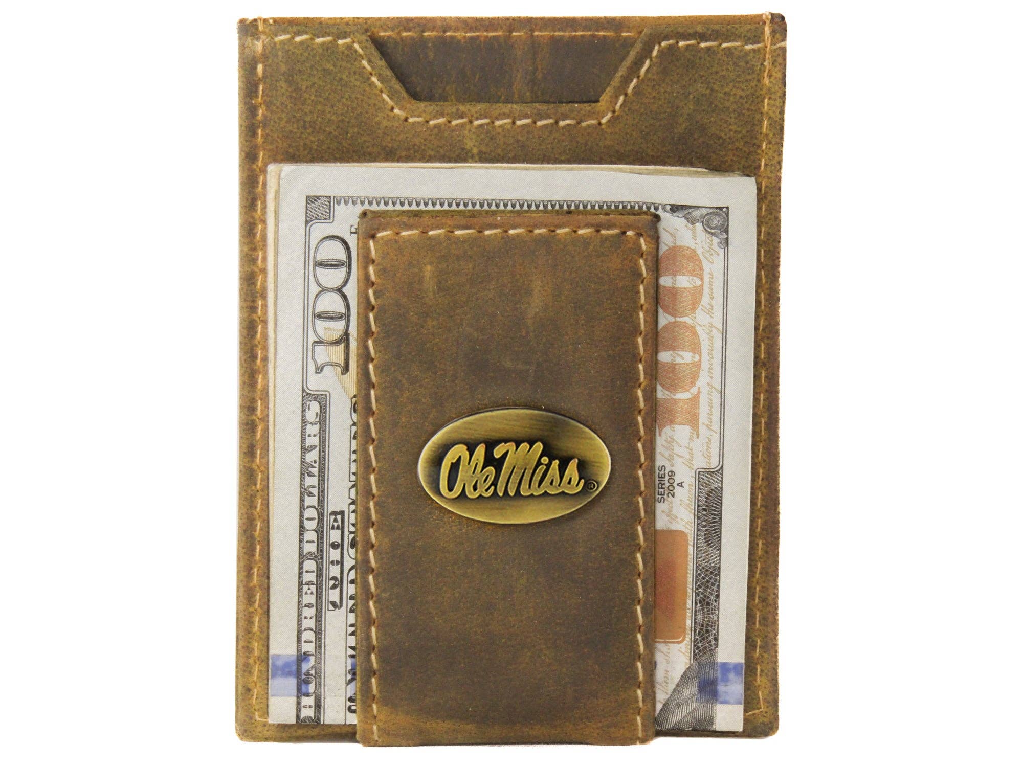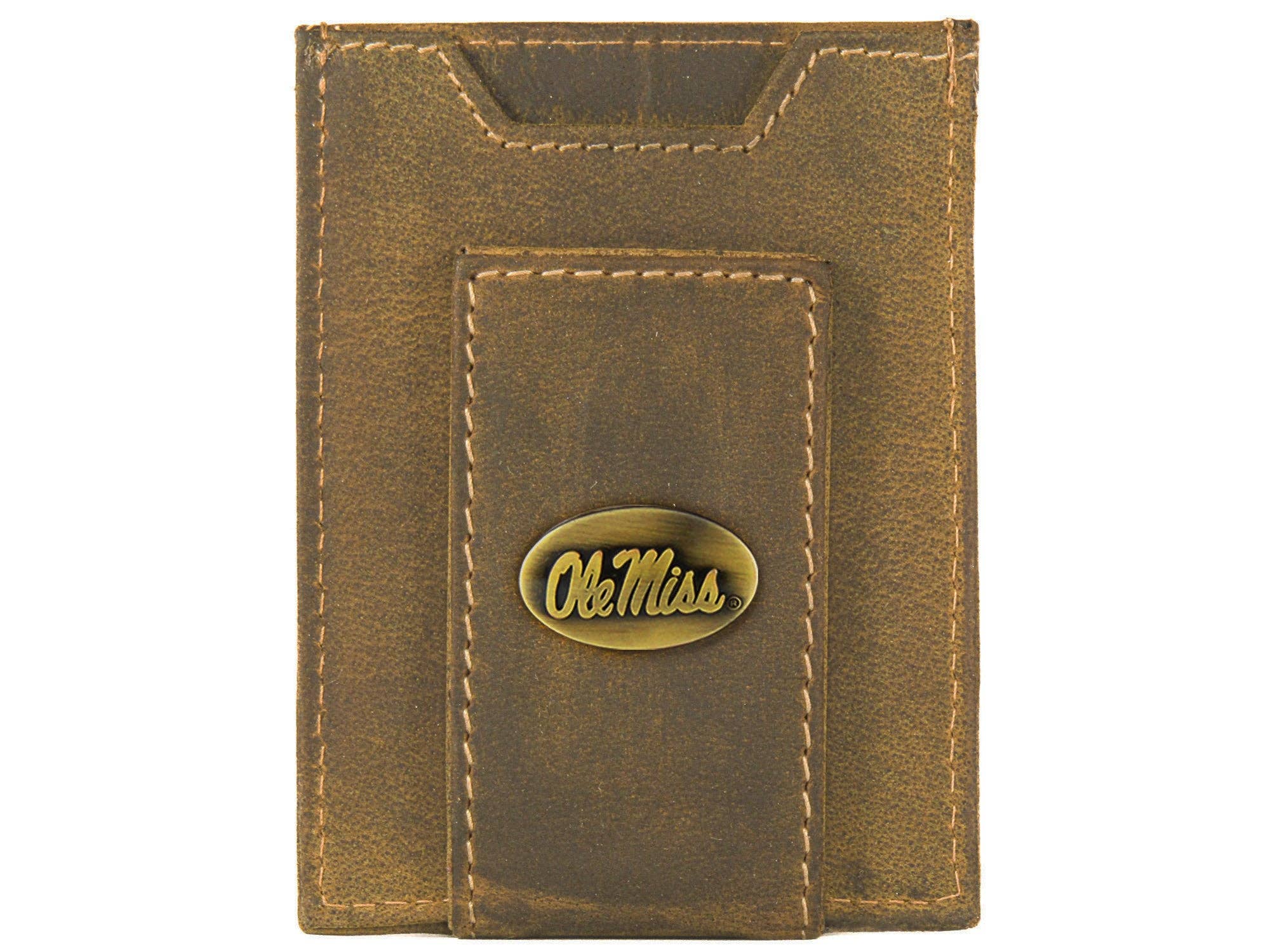 Show your Ole Miss Rebels pride with an original Zep-Pro collegiate vintage tan leather front pocket wallet. This accessory is popular among college students and alumni. It is a stylish and unique way to show enthusiasm while keeping important cards and cash organized. This Zep-Pro wallet is constructed of full grain leather with a vintage tan finish and features the school’s official logo, proudly displayed on the front. The metal concho emblem has an antique brass finish which perfectly accents this unique wallet.
