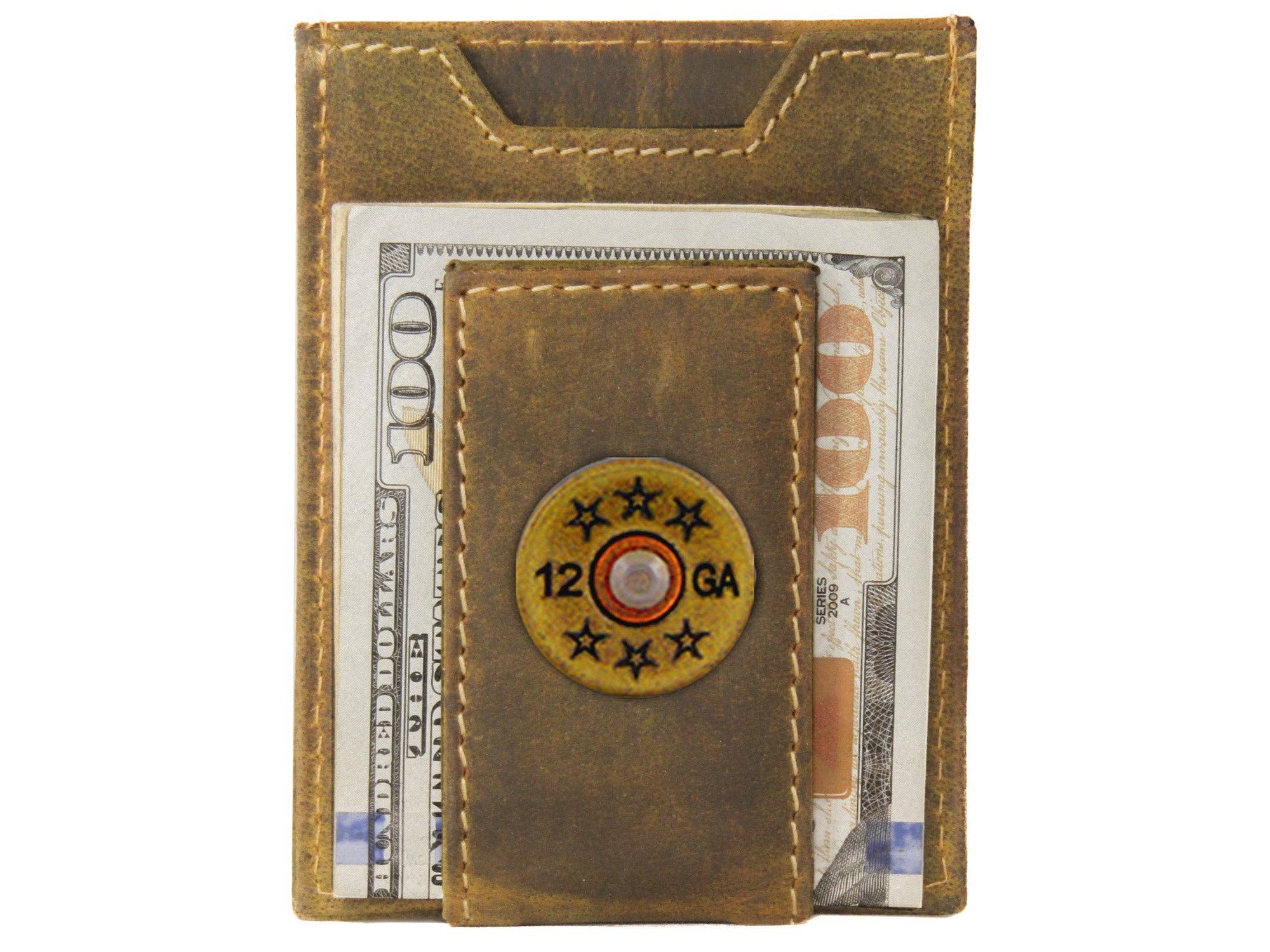 Show your Shotshell passion with an original Zep-Pro vintage tan leather front pocket wallet. The imagery on these wallets taps into our intrinsic connection to nature and wildlife. It is a stylish and unique way to show enthusiasm while keeping important cards and cash organized. This Zep-Pro wallet is constructed of full grain leather with a vintage tan finish and features the Shotshell design, proudly displayed on the front. The metal concho emblem has an antique brass finish which perfectly accents this unique wallet.