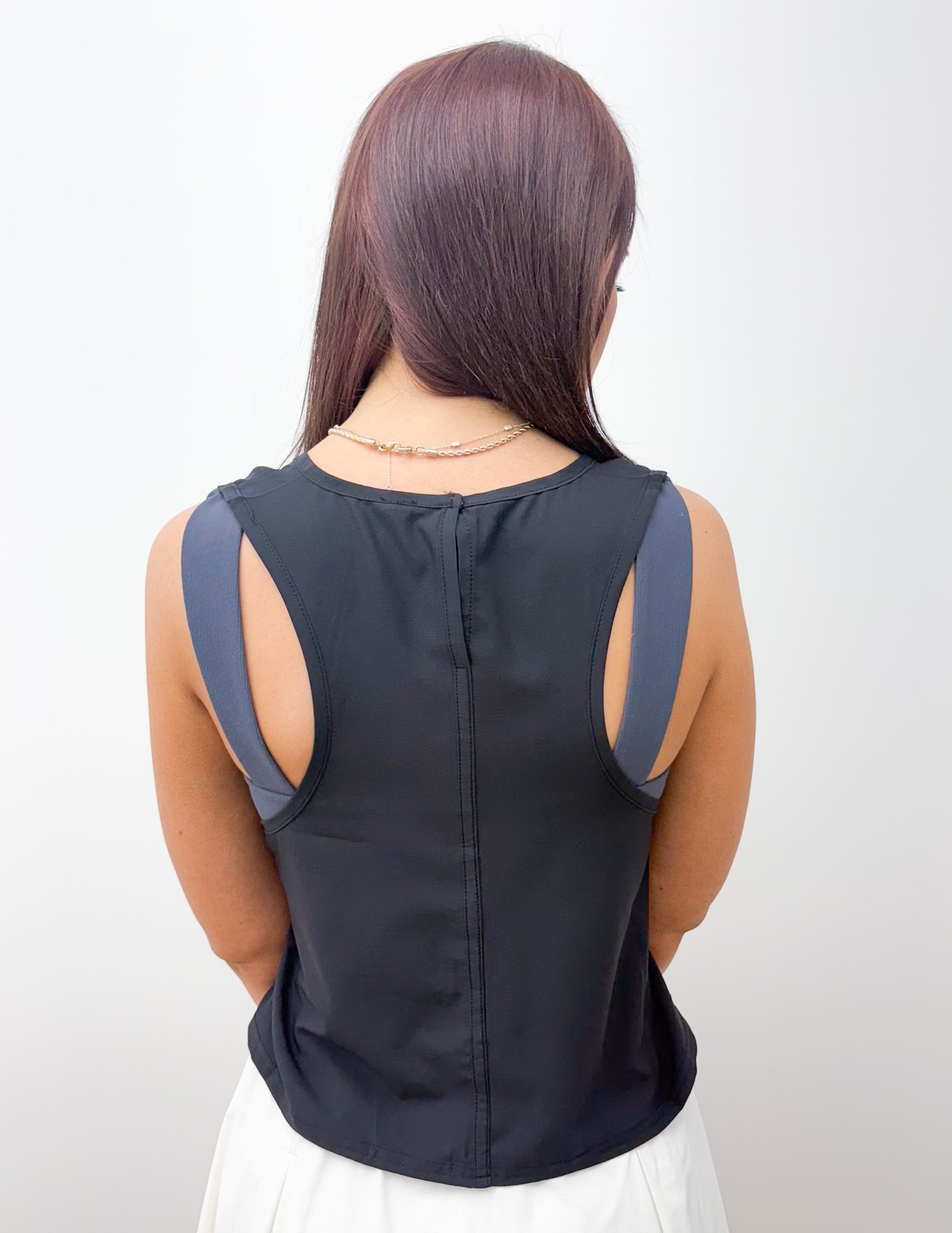 Trendy loose cropped tank top featuring a snap closure keyhole for a touch of edgy flair. Effortlessly chic and versatile.