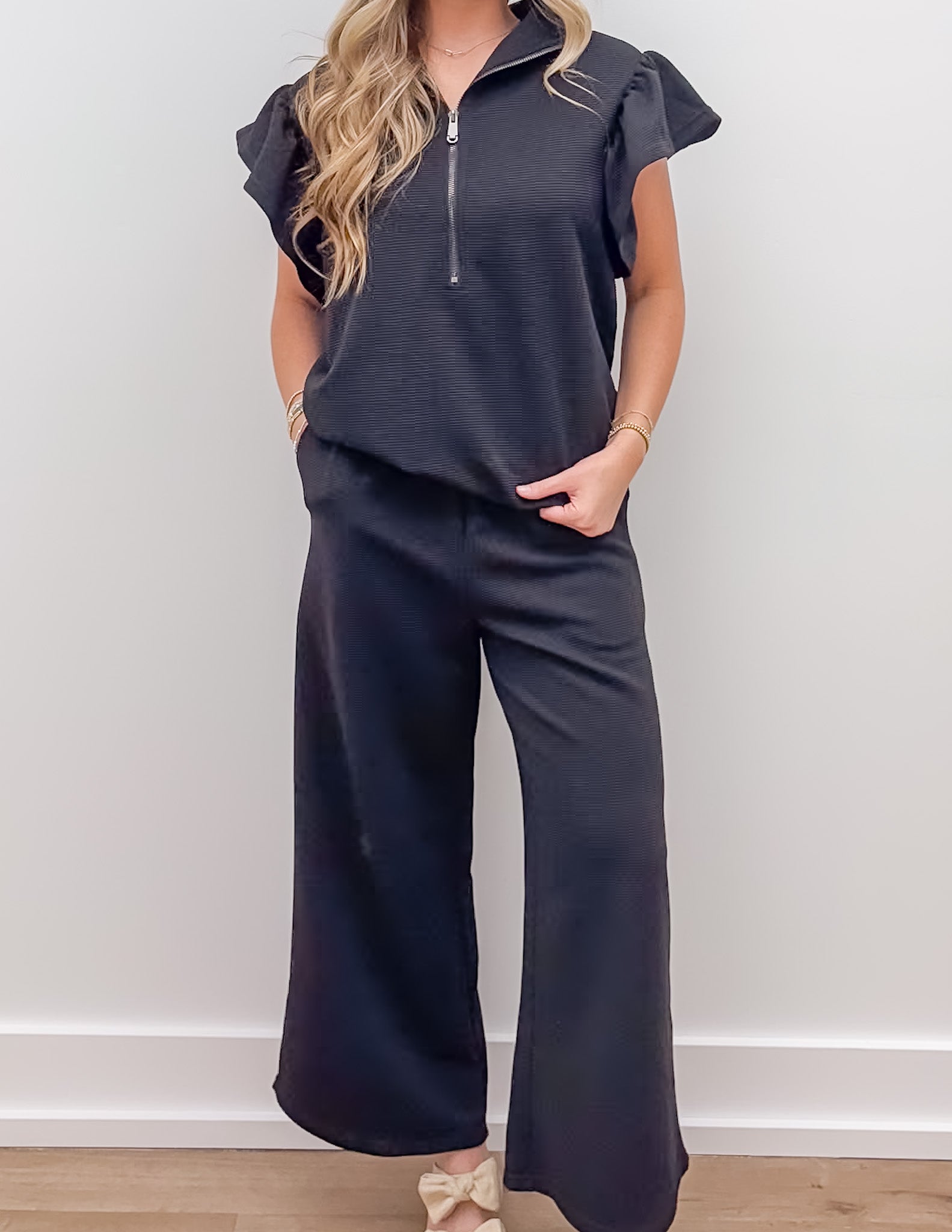 Elevate your style with this versatile two-piece set that effortlessly coordinates. Embrace a sleek and sophisticated aesthetic with solid color design. Make a statement with textured ruffled sleeves and a zipped neck feature that adds a touch of modern flair.