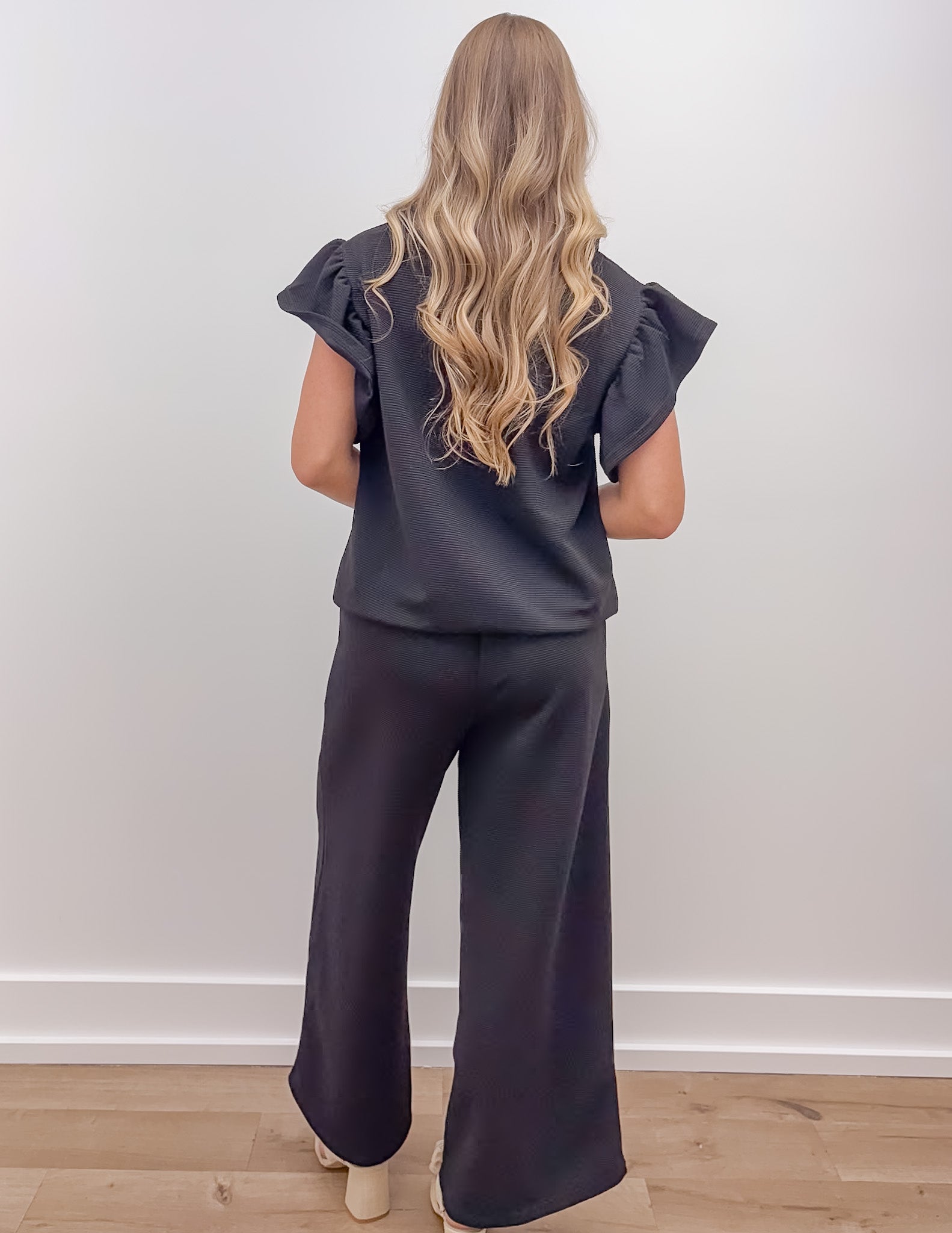 Broken Down Ruffle Top and Pants Set in Black