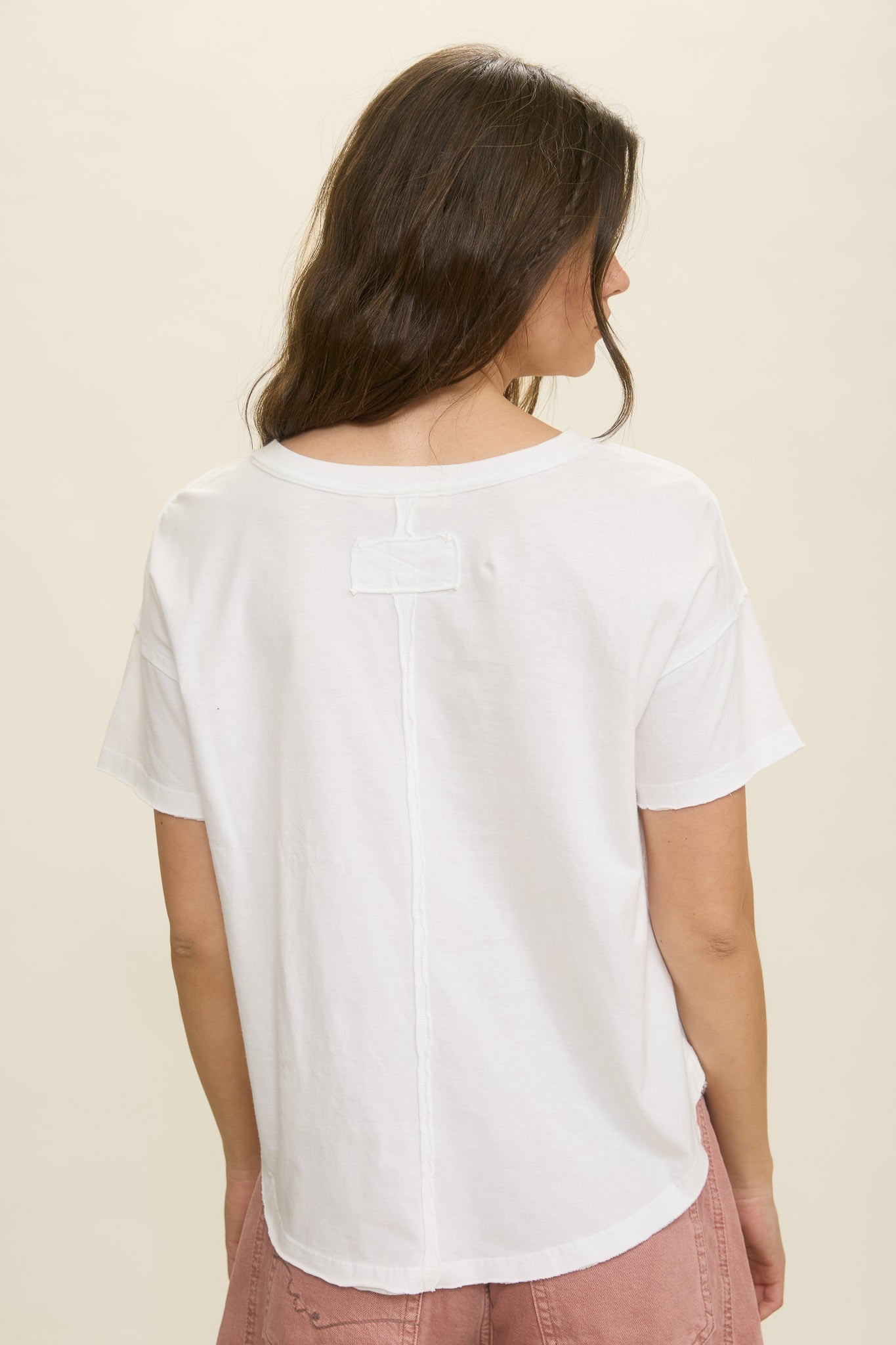 ROUND NECKLINE SHORT SLEEVES DROP SHOULDER U HEM EXPOSED SEAM RAW EDGE KNIT TOP 100% COTTON