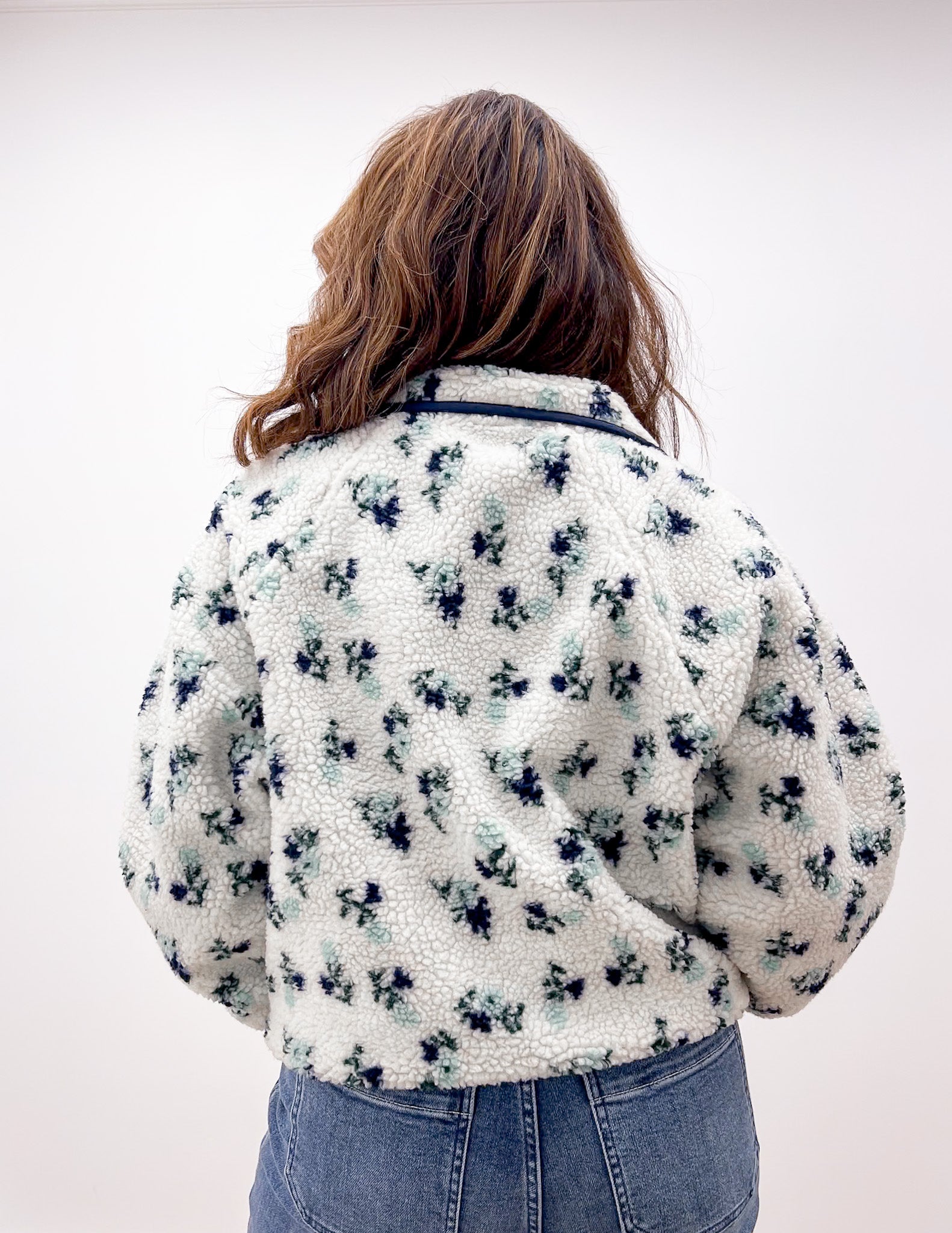 jacket. Featuring a soft, plush texture and a vibrant floral design,
