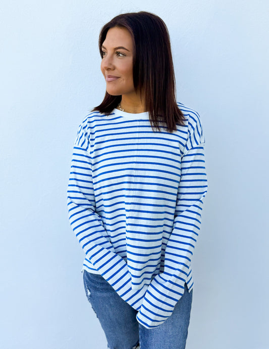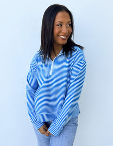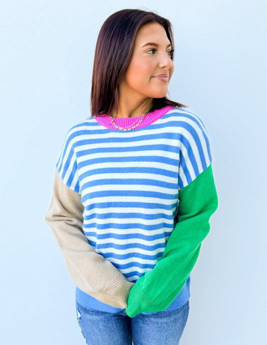 Spring Days Stripped Button-Up Sweater Top in Lemon/Blue