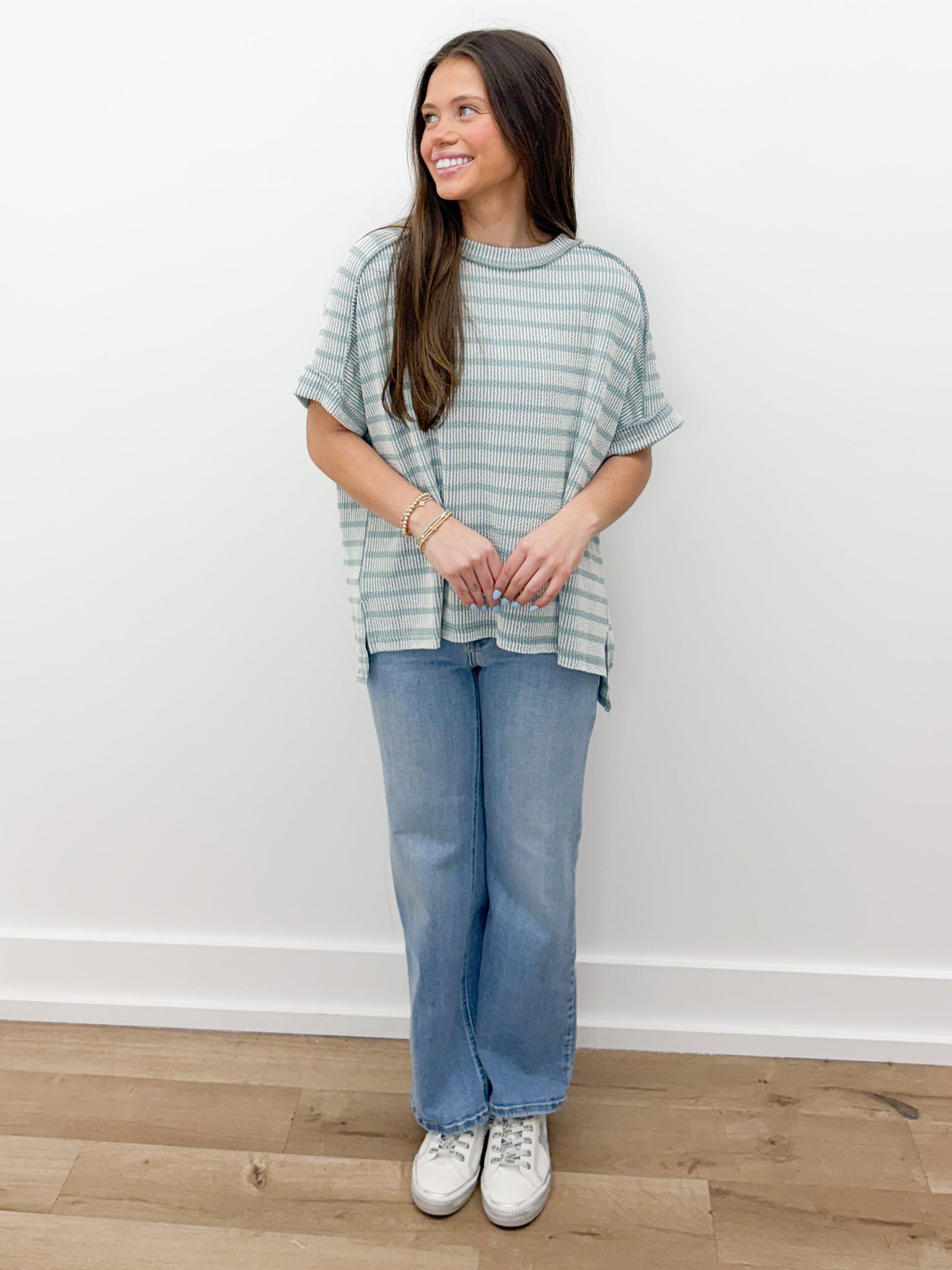 Sweet Time Raised Rib Striped Top in Ash Jade