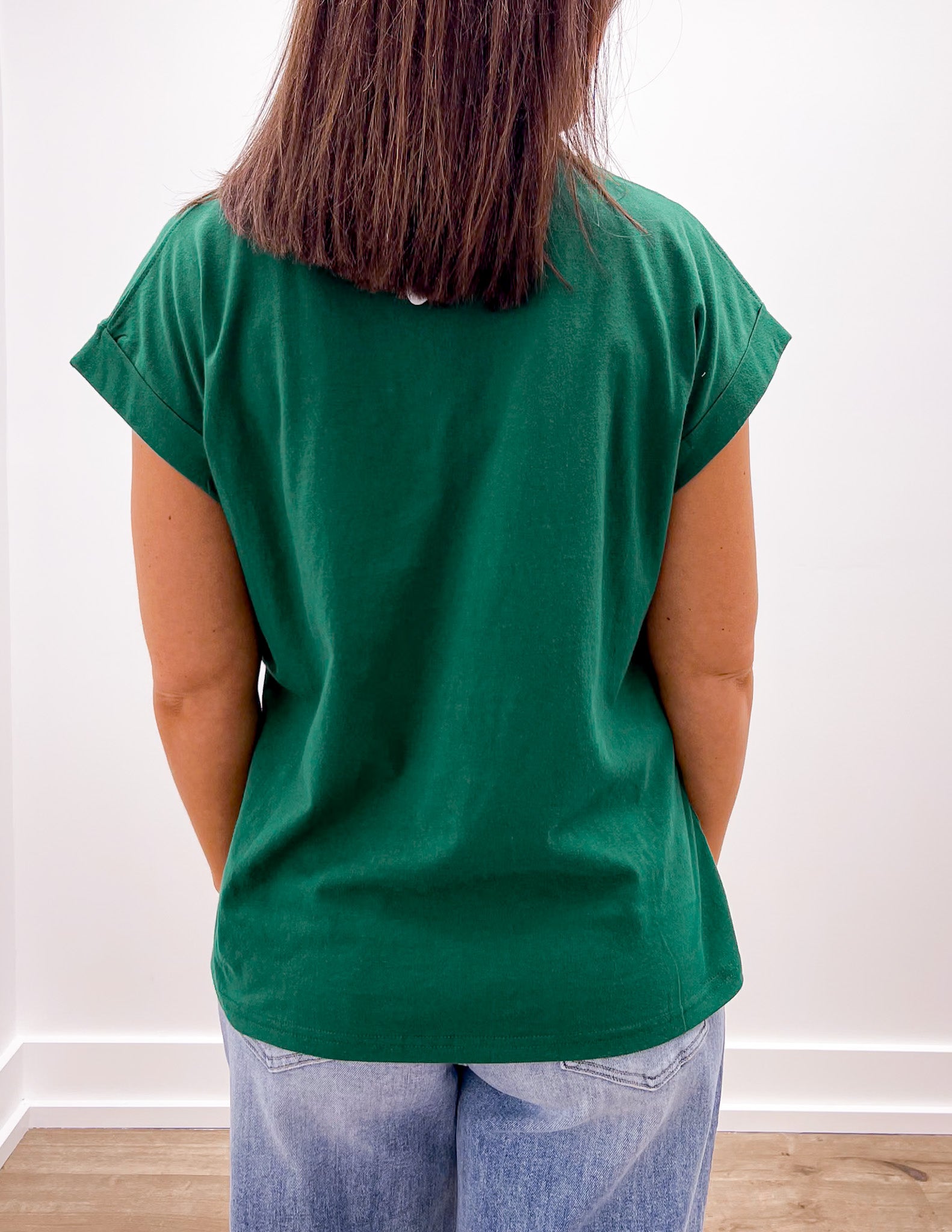 ROUND NECK FOLDED SHORT SLEEVE Top **RELAXED FIT** TOTAL BODY LENGTH: 24", BUST: 42" approx. - MEASURED FROM SMALL ** COLOR MAY VARY SLIGHTLY DUE TO MONITOR RESOLUTION