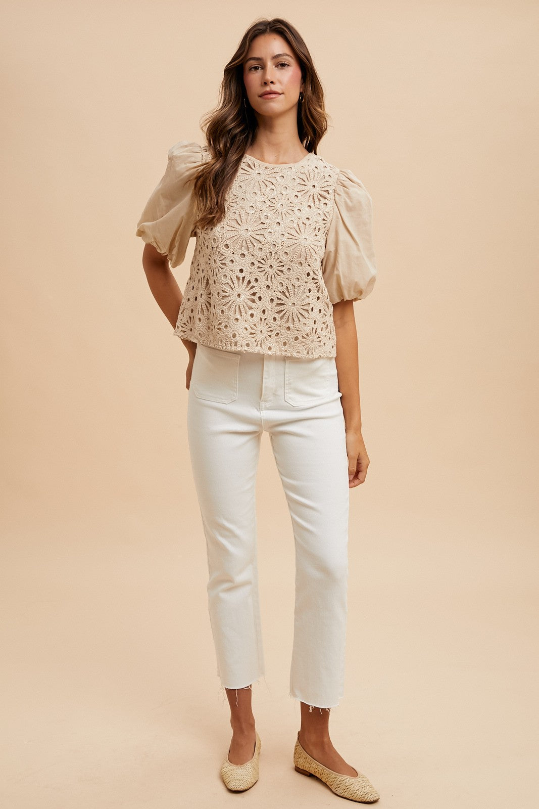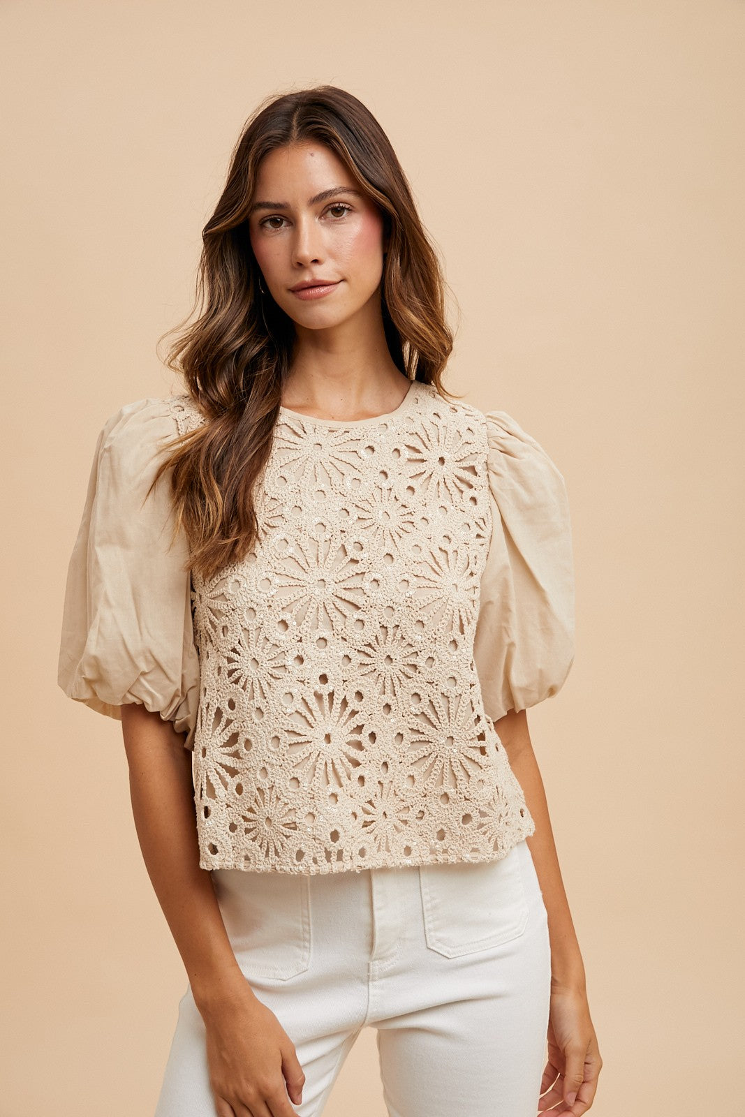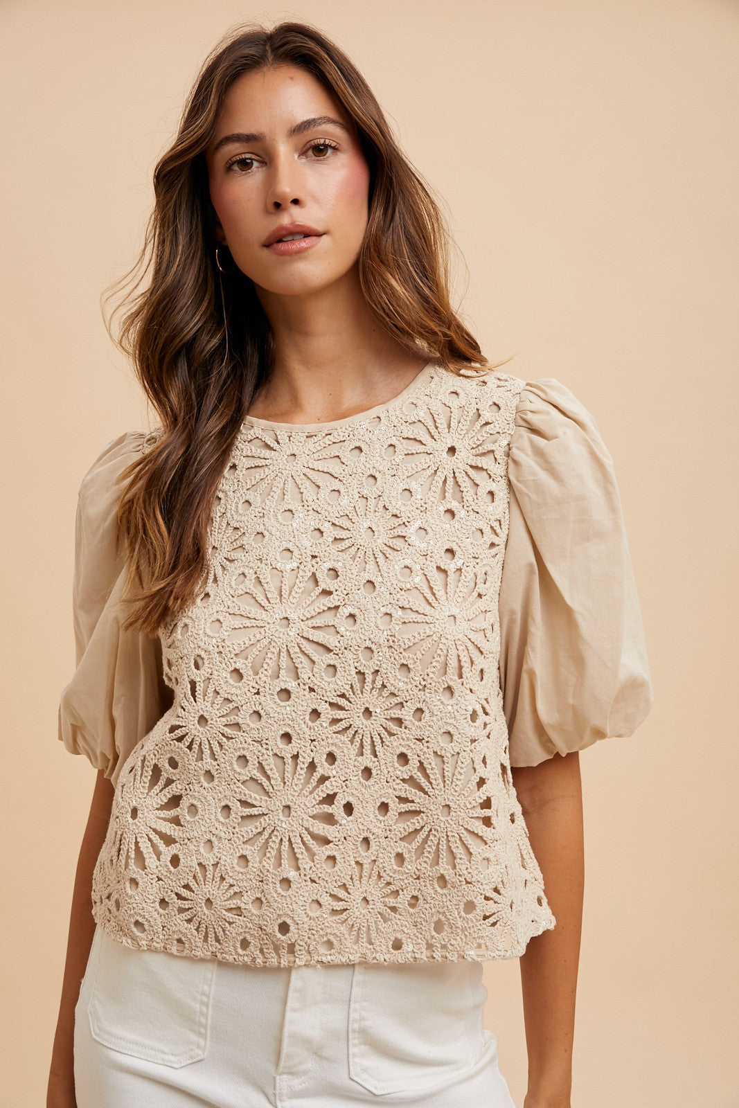MIX MEDIA SEQUIN CROCHET BODICE WOVEN BLOUSE - MIX MEDIA - SEQUIN CROCHET FRONT BODICE - SHORT BALLOON SLEEVE - ROUND NECK - KEYHOLE - RELAXED FITadult female