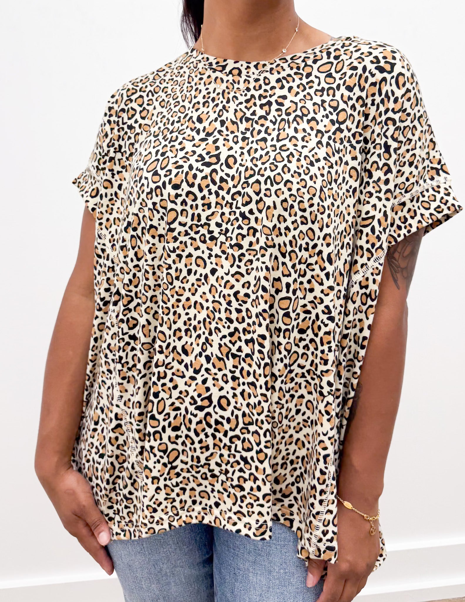 LEOPARD PRINTS OUTSEAM STITCH DETAIL SHORT SLEEVES TOP