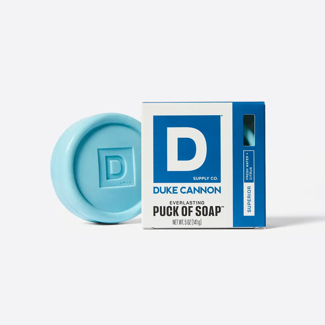 Duke Cannon always uses the right tool for the job. Like this superior-grade soap puck that fits snugly in his hand, for instance. Triple-milled to last longer, it easily outlasts common bar soaps.