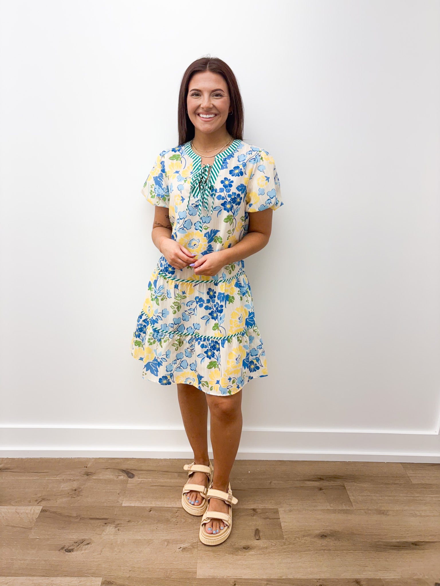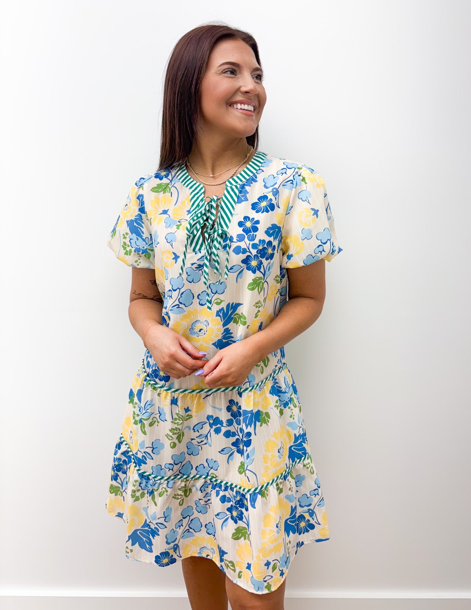 Floral prints with fuzzy stripes create a uniquely chic look.