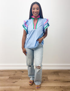 Solid flutter sleeve pullover top features multicolor accented ruffle neck and sleeve finish. Unlined. Woven. Non-sheer. Lightweight.