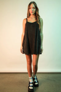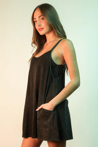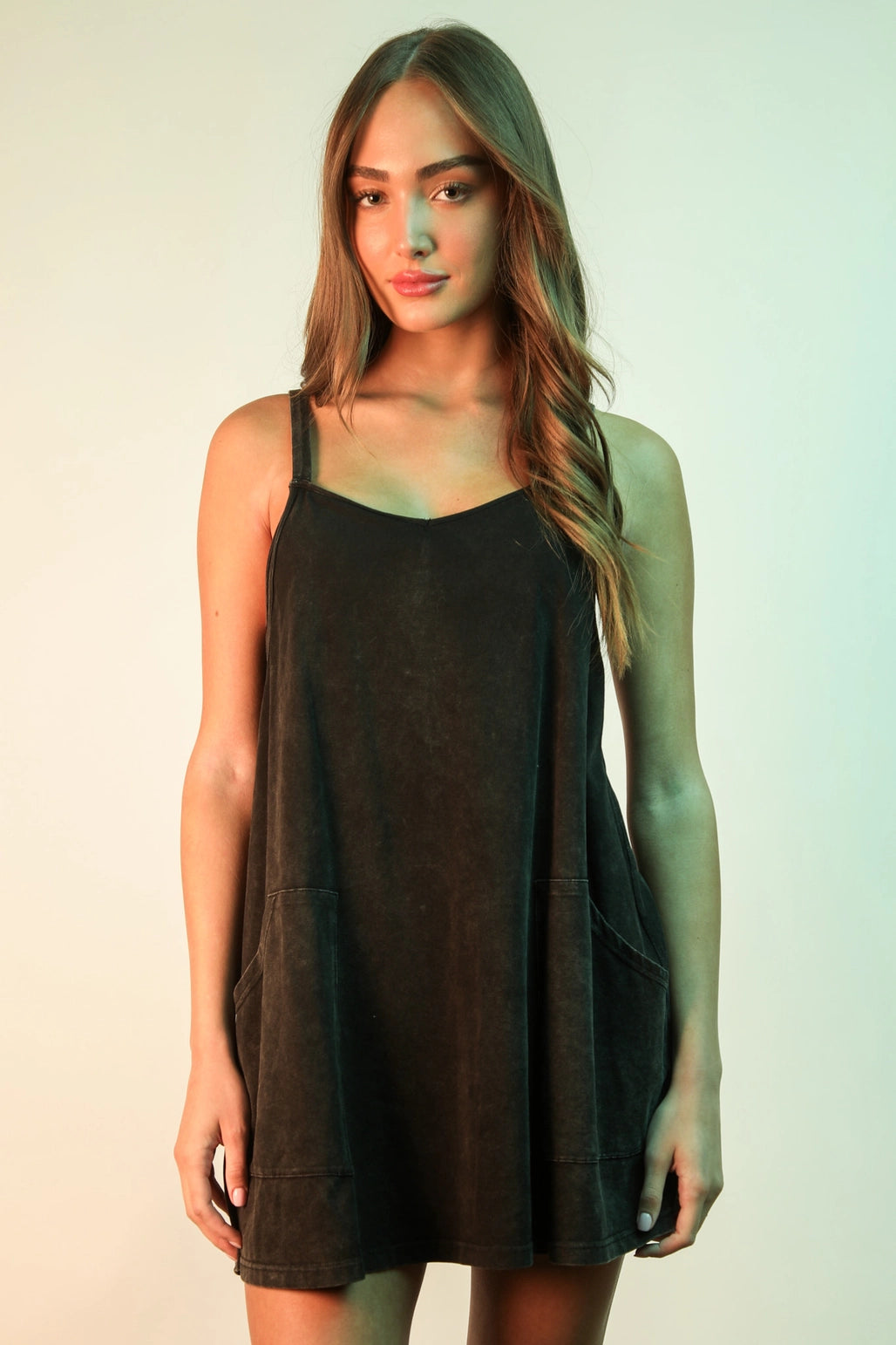 -Mineral Washed Knit Mini Dress with Shorts Inside -Deep V-Neck -Spring/Summer Wardrobe Essentials Style -Basic Essential Mineral Wash Style Dress -Casual Summer Cotton Sleeveless Dress -Raw Edge Detail -Side Pockets adult female