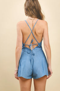 Denim V-neck halter romper featuring an adjustable X-tie back, zippered back closure, and convenient side seam pockets.