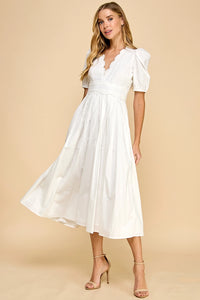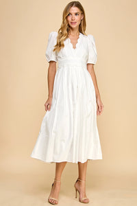 Solid midi dress featuring a V-neckline with scalloped detail, short puff sleeves, a belted waist, and a concealed back zipper.