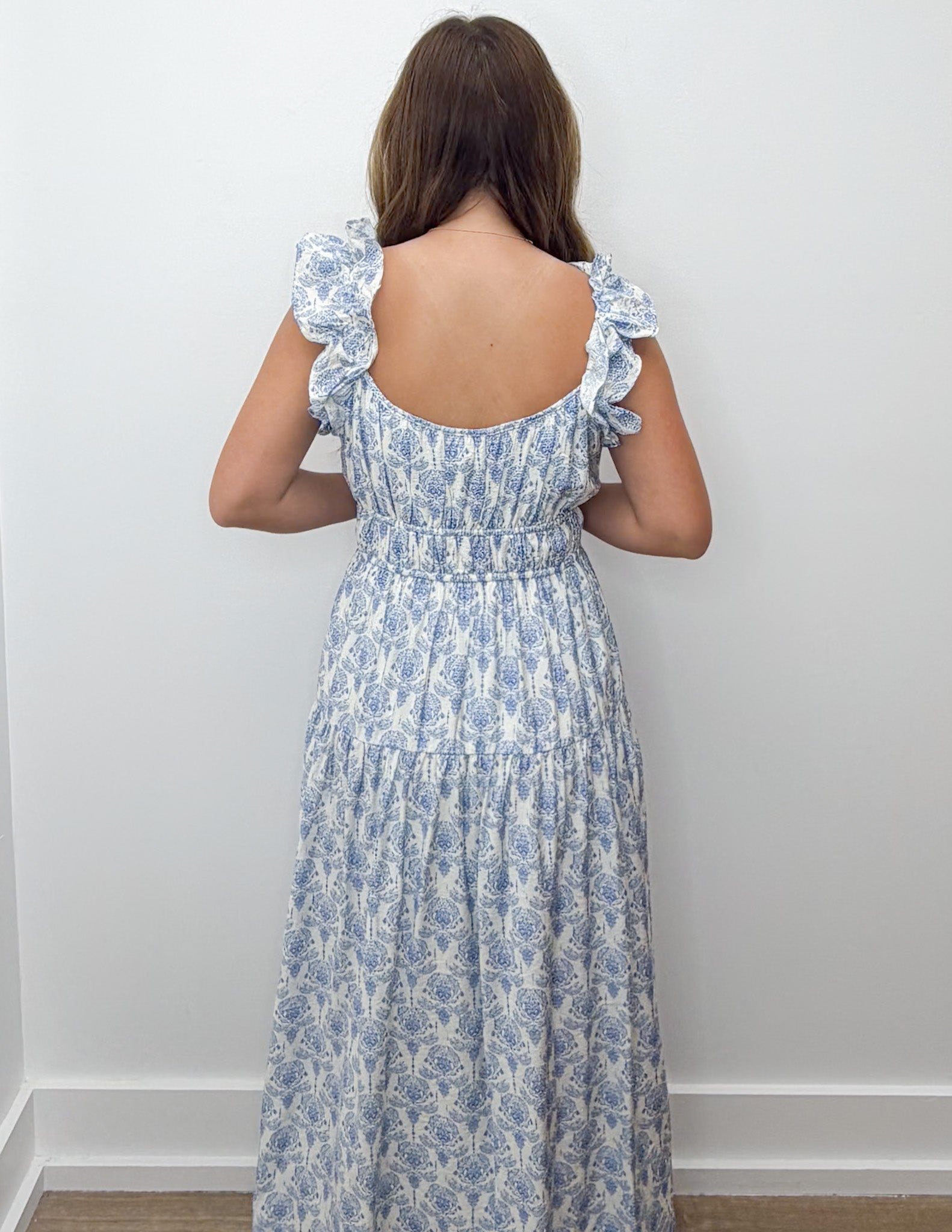 A printed maxi dress featuring ruffled shoulder straps and a soft square neckline. The waist is cinched with elastic for a flattering fit, complemented by a flowy, airy skirt