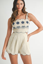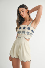 Embroidery sleeveless side and back cut out romper with scallop hem detail. Back exposed zipper.Adult Female